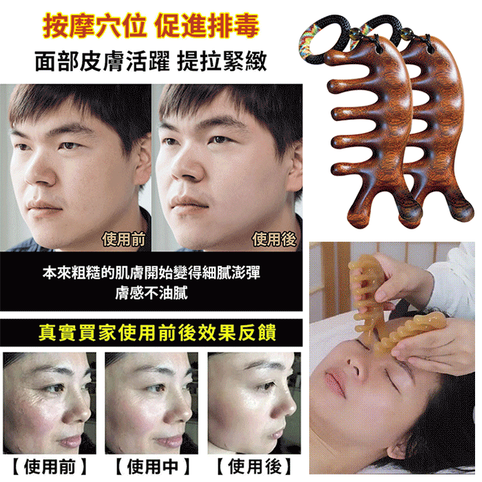 7分鐘前天然檀木美容經絡按摩梳 ◀頭臉按摩◀疏通經絡◀刮痧排毒 按摩穴位促進排毒,面部提拉緊緻 - 【疏通經絡,刮痧排毒】3入組HK$296